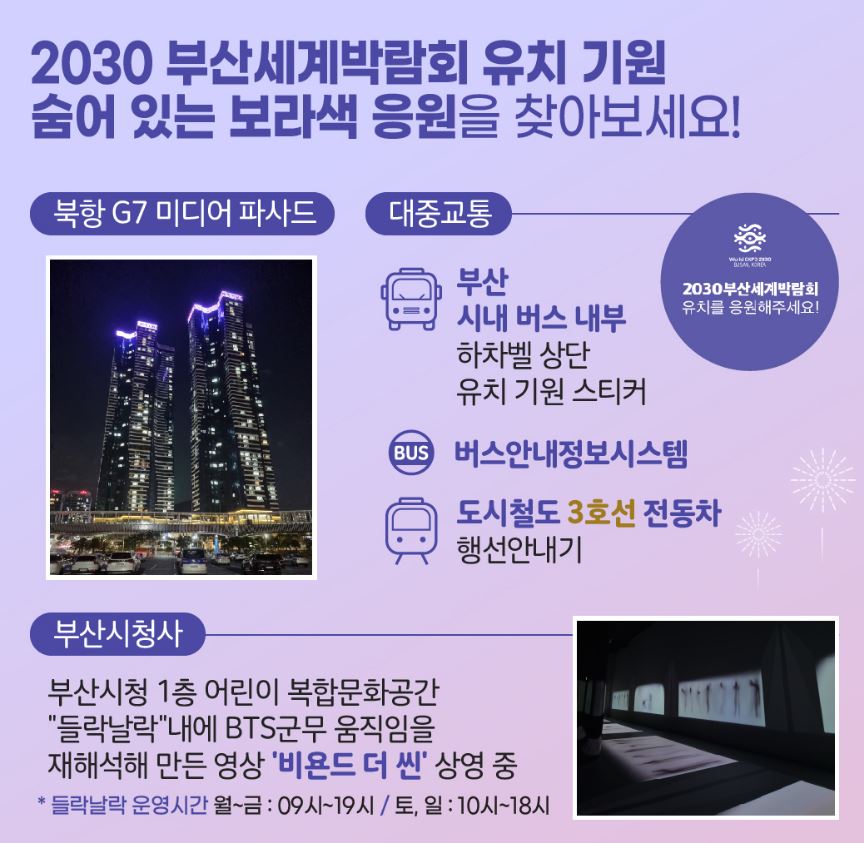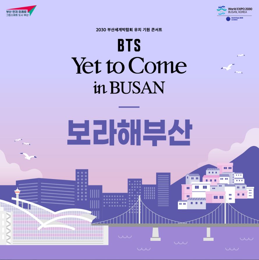 전 세계적인 글로벌 아이돌 그룹 방탄소년단(BTS)이 2030 부산 세계 박람회(엑스포) 유치를 기원하며 콘서트를 진행합니다. 이에 따라 부산광역시에서는 아시아드 주경기장을 비롯해 부산 시청, 광안대교, 남항대교, 다이아몬드 타워 부산, 부산신항, 영화의 전당, 다대포 낙조 분수 등 부산 시내의 주요 랜드마크들과 부산 역(2층), 게이트 상단, 김해공항 입국장(2개소) 및 출국장(1개소), 공항 대합실(2층), 서부 시외 버스터미널 대합실(1층) 등 관문 지역, 도시 철도(3호선) 전동차 행선 안내기 및 버스 안내 정보 시스템(432개) 등 교통 시설 등도 속칭 "보라해 부산"에 동참하고 나섰습니다.