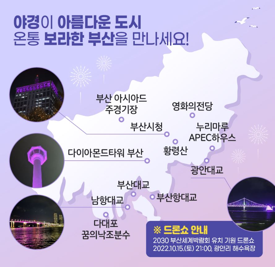 때문에 부산광역시는 방탄소년단의 콘서트를 맞이하여 부산의 곳곳을 보라색으로 물들이며 보라해 부산이라는 말로 방탄소년단을 맞이하고 있습니다. 2030 부산 세계 박람회 유치를 기원하며 글 마칩니다.