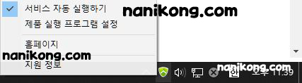 메뉴에 '서비스 자동 실행하기', '제품 실행 프로그램 설정', '홈페이지', '지원 정보' 등 메뉴가 나타날 것입니다. 이제 제품 실행 프로그램 설정을 클릭해줍니다.