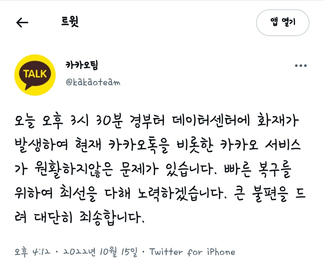 지난 2022년 10월 15일 토요일, 카카오 SK C&C 판교 클라우드 데이터 센터에서 화재가 일어나면서 다음, 멜론, 티스토리 블로그 등 카카오 계열의 서비스가 동시에 장애가 발생하면서 마비되는 사건이 일어났습니다.