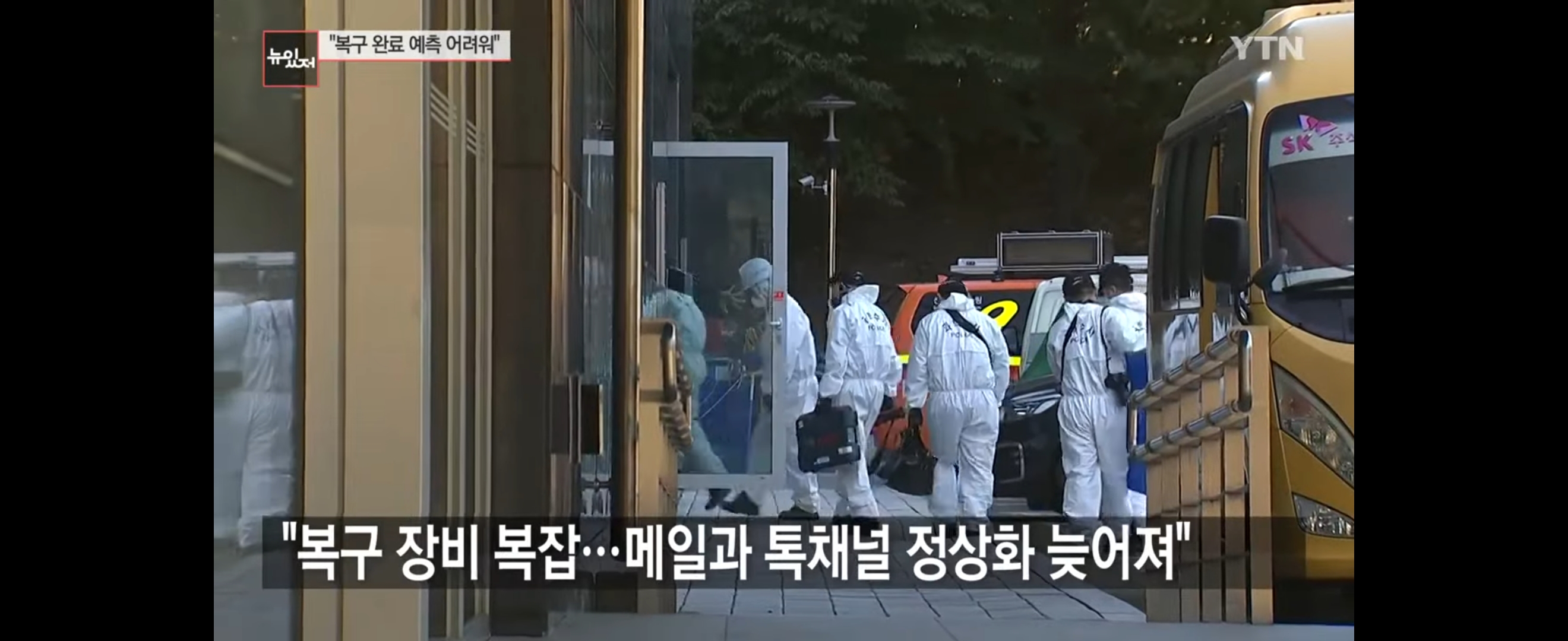 그리고 금일 오전 카카오는 "오늘(10월 18일) 오전 9시 현재 카카오 메일의 주요 기능이 복구 완료됐으며, 현재 다음 메일을 복구하고 있다"고 발표했습니다. 현재까지 카카오 주요 서비스 중 복구가 완료된 서비스는 카카오 T, 카카오 내비, 카카오 맵, 카카오 뱅크, 카카오 페이지, 카카오 웹툰, 멜론, 카카오 게임즈 등이 있습니다. 그러나 포털 서비스 다음의 카페, 카카오 스토리, 카카오 브런치, 티스토리 검색 기능 등 아직까지도 복구가 되지 않고 진행 중에 있습니다.