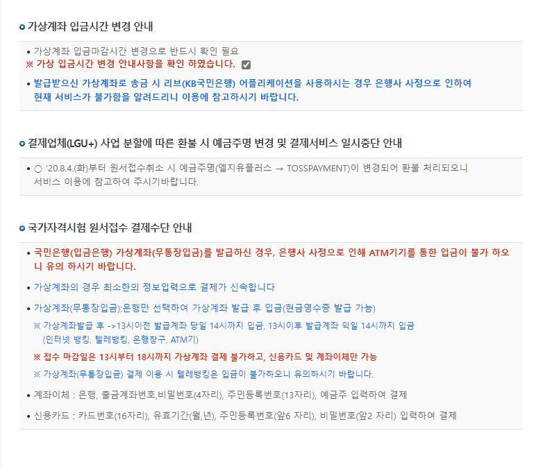 본인이 선택한 시험 회차, 장소, 시험일자, 접수 비용 등을 확인하고 아래에 가상입급계좌 등 안내사항을 참고하고 난 결제하기를 누릅니다.