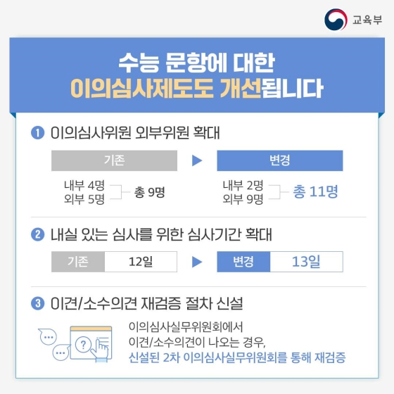 시험 문제 자체는 작년도 수능 시험과 동일한 부분이지만 점수 반영과 출제 기준을 개선하게 된다고 합니다. 그리고 이에 따라 이의 신청된 문제들을 보다 확실하게 심사하기 위해서 이의 심사 제도도 개선 된다고 합니다. 그럼 어떤 부분들이 개선되는 것인지 확인해 보겠습니다. 자세한 내용은 사진을 참조해주시길 바랍니다.