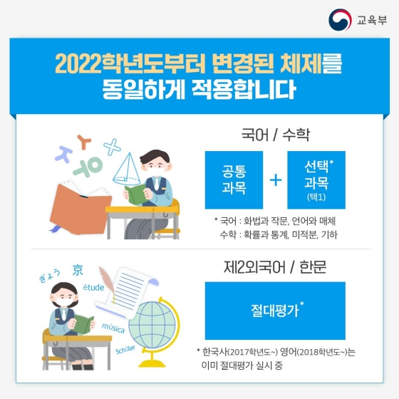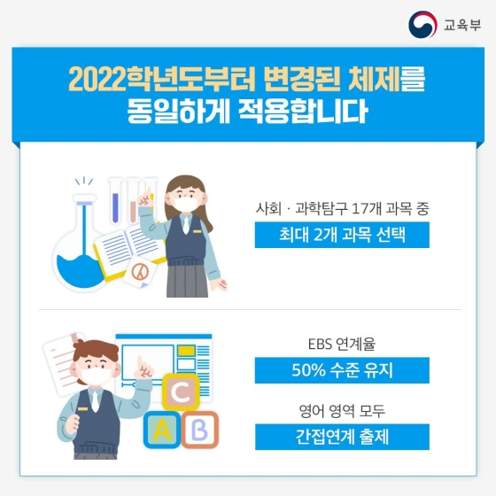 원서접수 기간은 이미 지났기 때문에 따로 언급하지 않겠습니다. 수능 시험일은 2022년 11월 17일이고 문제 및 정답의 이의신청은 2022년 11월 17일부터 11월 21일까지 5일간 진행됩니다. 그리고 2022년 11월 29일에 정답이 확정되면 2022년 12월 9일 수능 성적이 통지됩니다. 일정에 대해 알아봤으니 다음은 수능, 대학능력시험의 변경점과 과목에 관련해 알아보겠습니다.