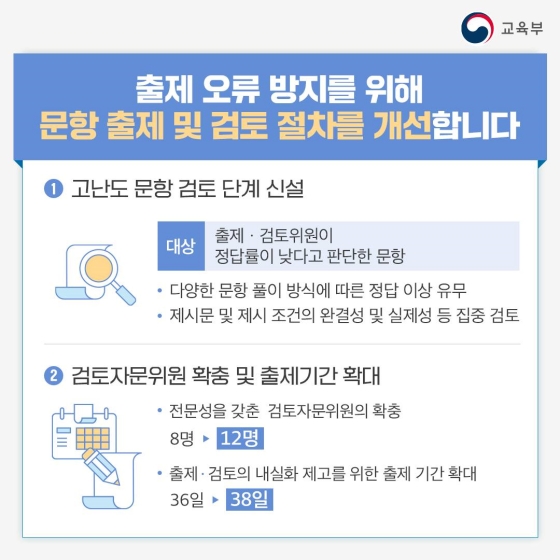시험 문제 자체는 작년도 수능 시험과 동일한 부분이지만 점수 반영과 출제 기준을 개선하게 된다고 합니다. 그리고 이에 따라 이의 신청된 문제들을 보다 확실하게 심사하기 위해서 이의 심사 제도도 개선 된다고 합니다. 그럼 어떤 부분들이 개선되는 것인지 확인해 보겠습니다. 자세한 내용은 사진을 참조해주시길 바랍니다.