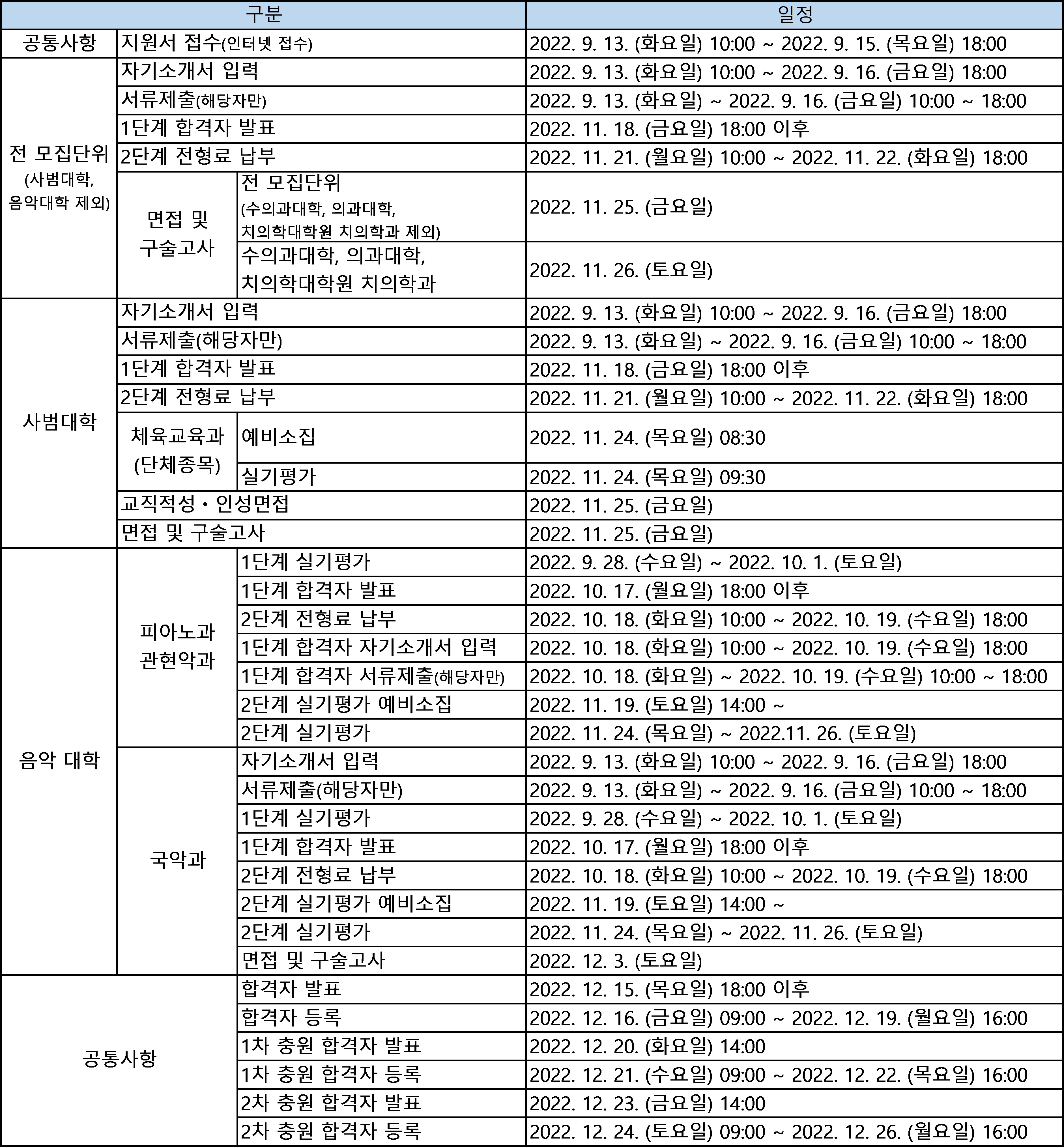 | 일반 전형(음악 대학 제외) | 2023년 2월 졸업 예정자를 포함한 고등학교 졸업자 또는 법령에 의해 고등학교 졸업 이상의 학력이 인정된 자 |