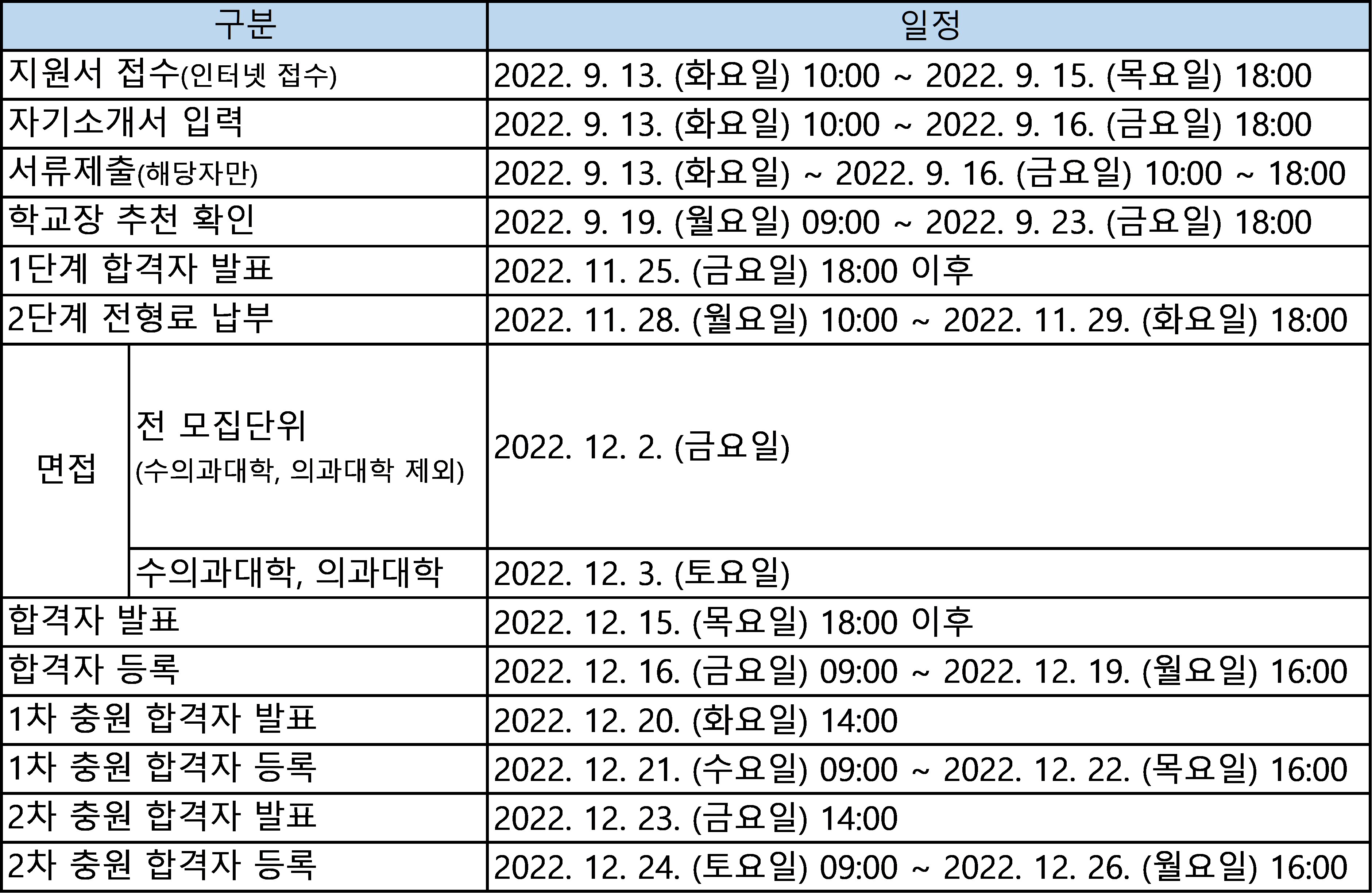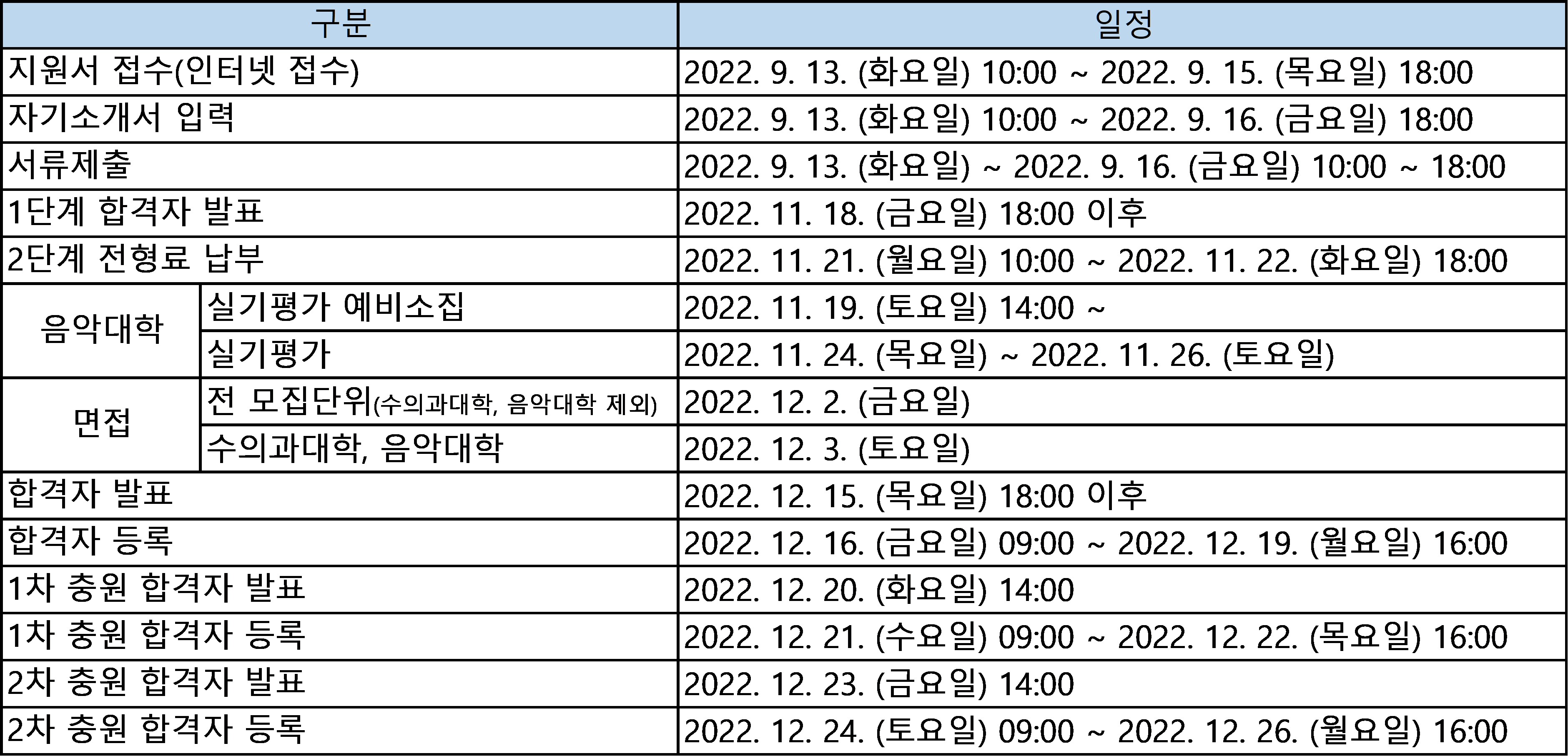 일반 전형(음악 대학 제외) 2023년 2월 졸업 예정자를 포함한 고등학교 졸업자 또는 법령에 의해